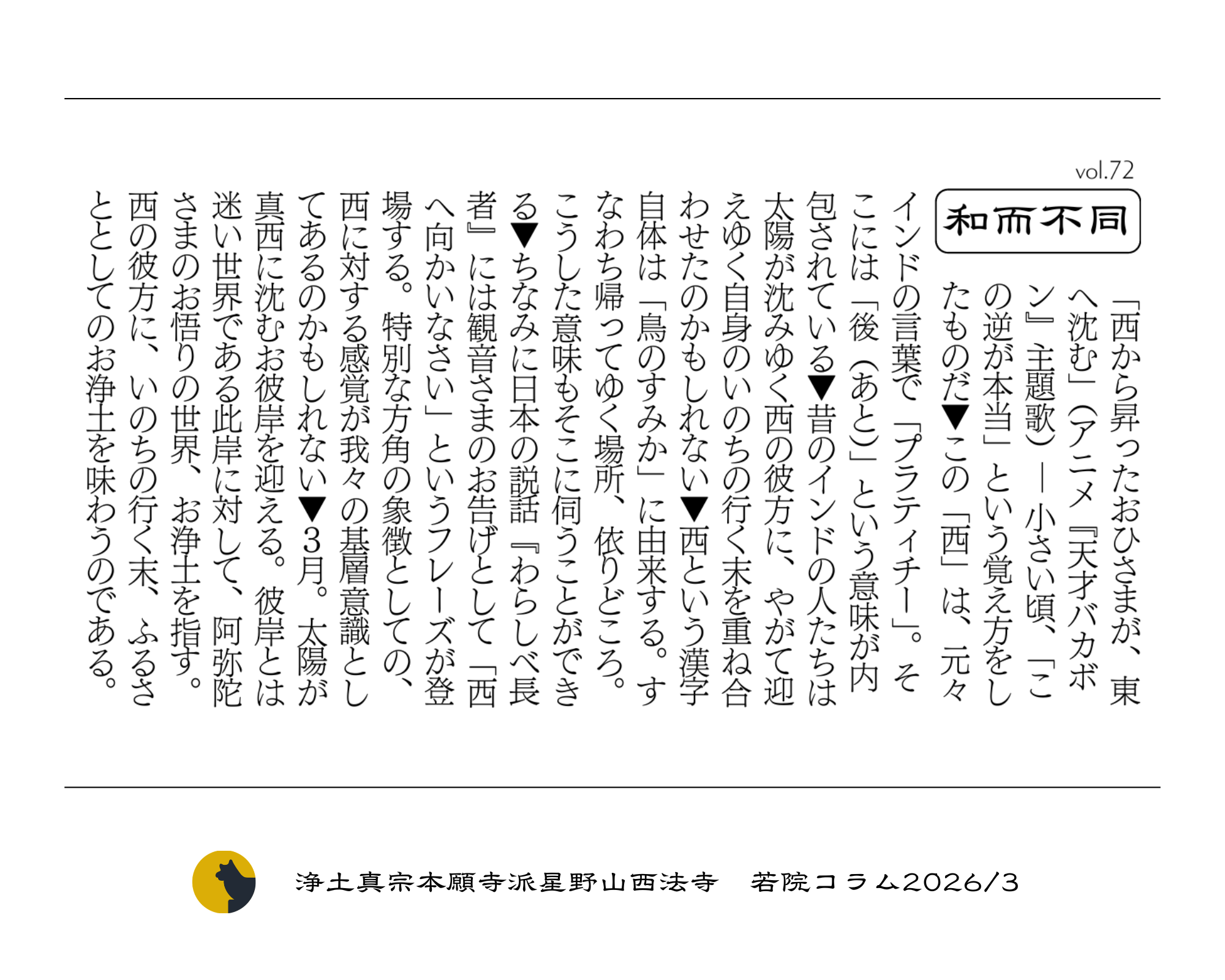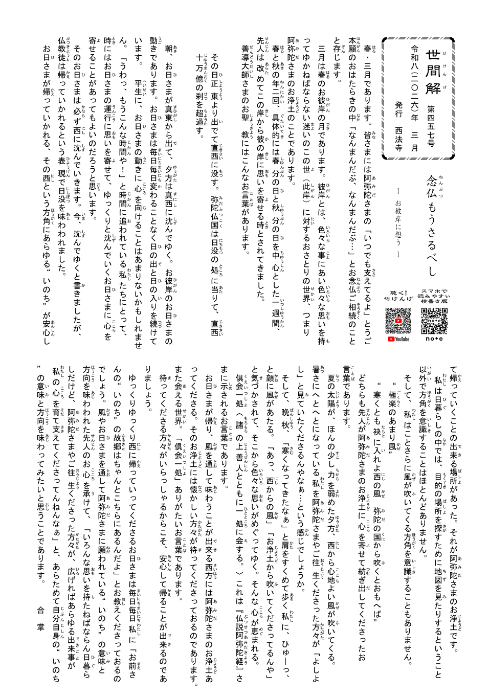 投稿日: 2026年3月1日 投稿者: 管理者【今月の読みもの】短編法話『世間解(せけんげ)』2026年3月号/若院コラム『和而不同』 〔毎月発行〕さいほうじの読みもの最新号をお届けします👏 ◆住職の短編法話『世間解(せけんげ)』 タイトル〔お浄土に想う〕 ◆若院コラム『和而不同』〔 西 〕 どうぞご覧ください。 〔紙面版〕ダウンロード 〔note〕~横書きでさらに読みやすく~