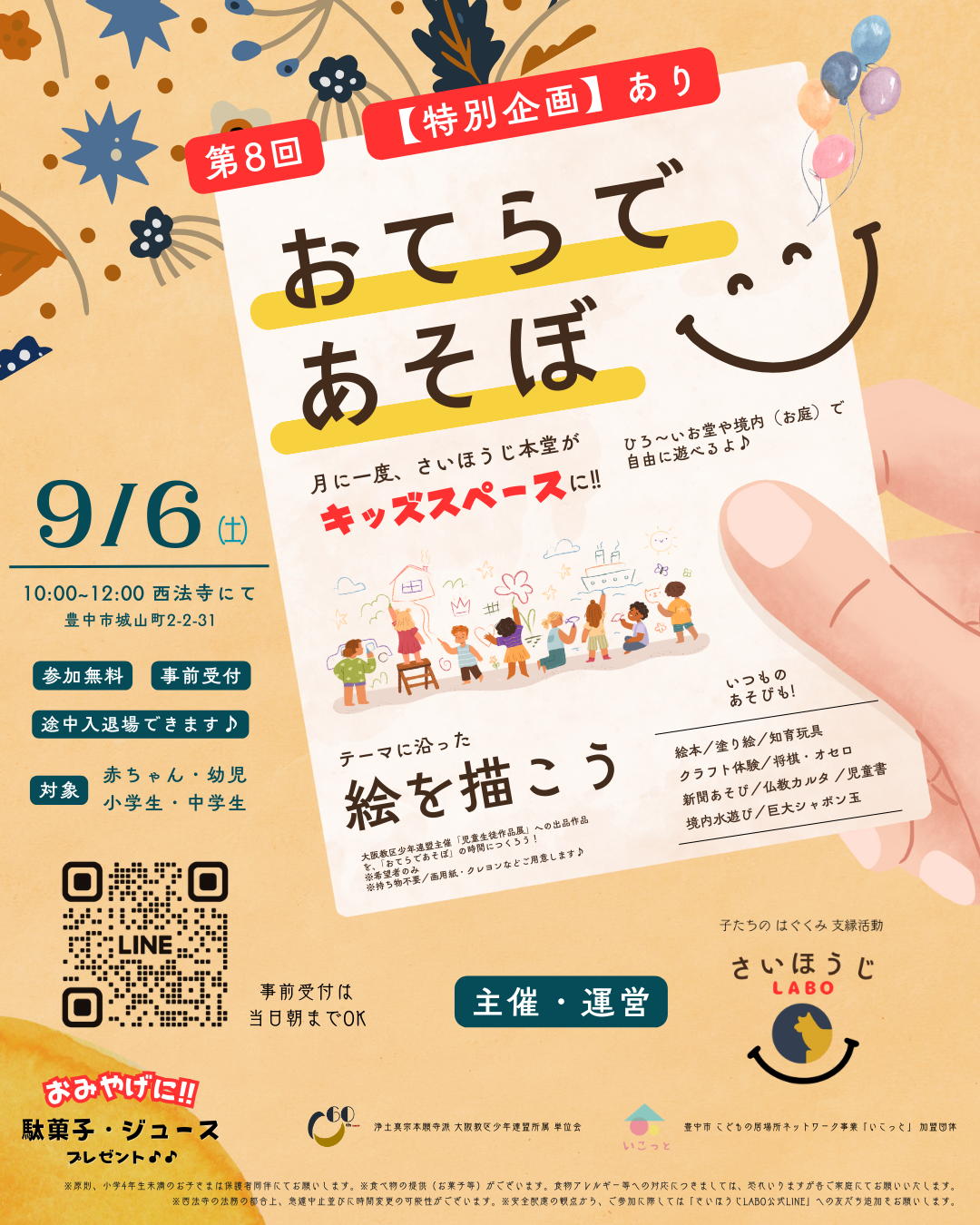 2025年9月6日㈯、子たちのはぐくみ支縁活動さいほうじLABO主催『おてらであそぼ(第8回)~〔企画〕大きな画用紙に絵を描こう☺』を実施しました。